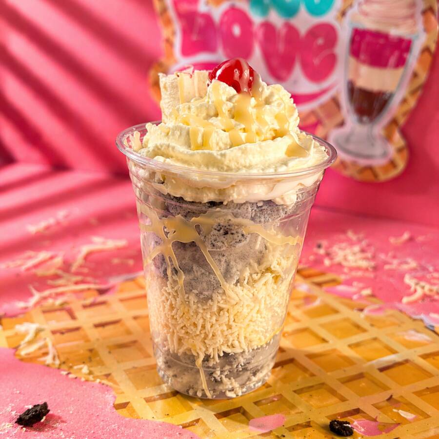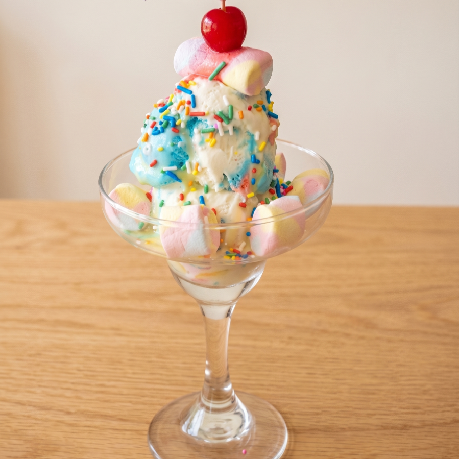 Deliciosa combinación de masmelo, helado carnaval, lecherita, cereza y chips de colores.