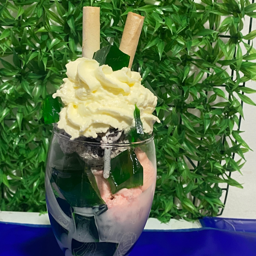 Crema de la casa, gelatina, queso, 2 bolas de helado, chantilly y barquillos.