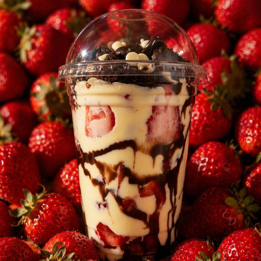 Fresas frescas, crema de la casa, brownie en trozos, chips de chocolate y barquillos piazza.