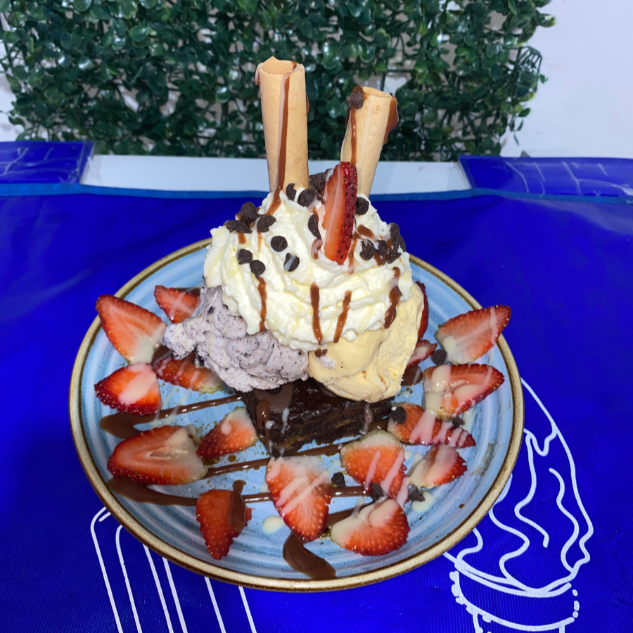 Porción de brownie con 2 bolas de helado, chantilly, barquillos, fresa, salsa de chocolate, brownie, chips de chocolate y lecherita.