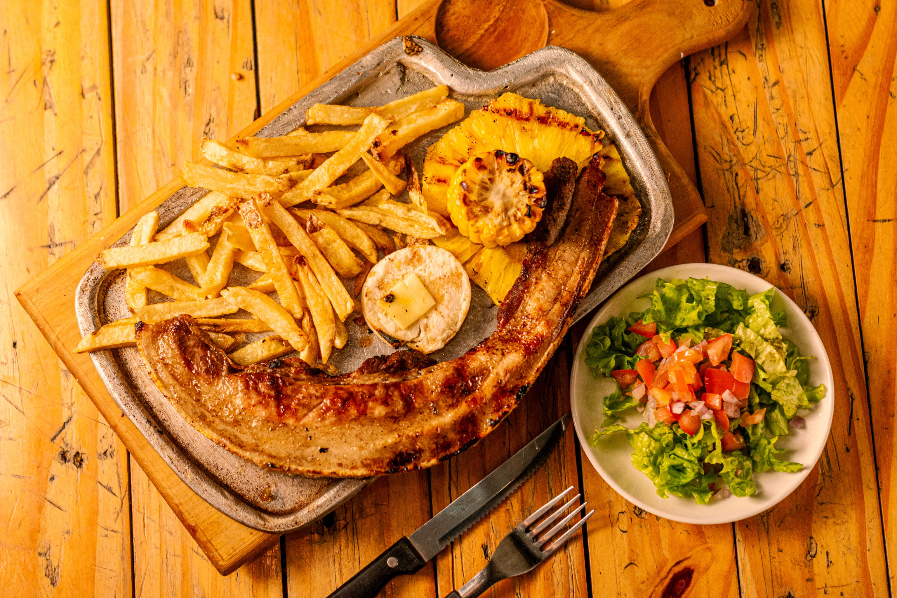 250 g Chicharrón a la parrilla, papas a la francesa, piña asada, arepa frita, mazorquita, ensalada y gaseosa.
