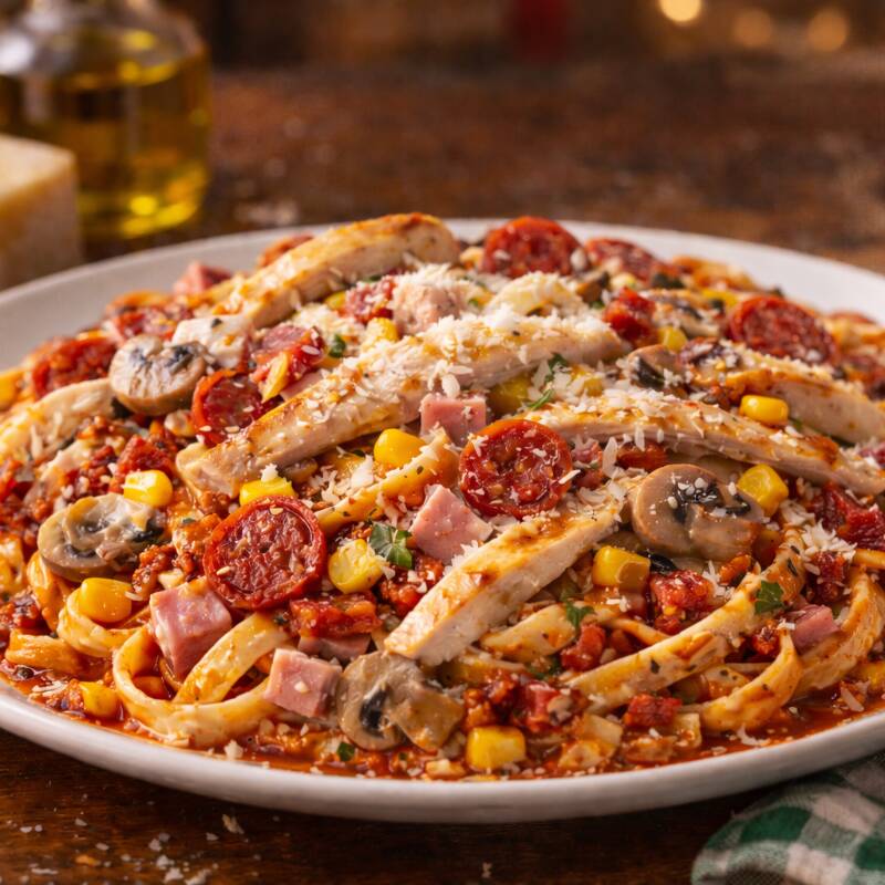 mazza de pizza, pollo, pepperoni, jamon, miaz, tocineta, salsa de pizza, mozzarella