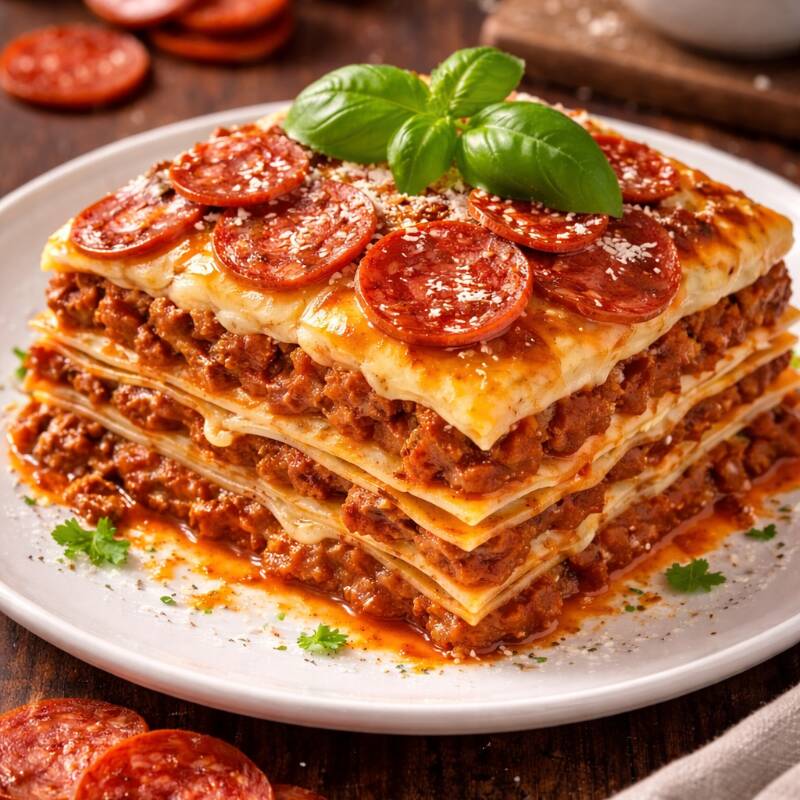 Laminas de pasta Italiana, salsa boloñesa de la casa, tocineta ahumada, Pepperoni Italiano, salsa bechamel, mozzarella gratinada y tostadas de ajo ( tamaño 16 Oz peso 450 grs)
