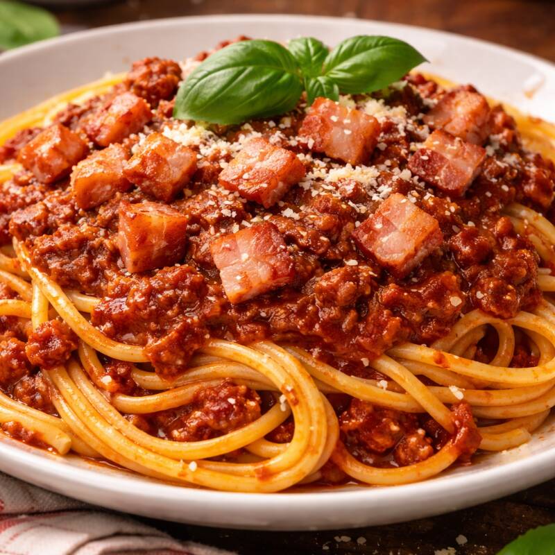 Pasta larga bañado en salsa boloñesa con tocineta ahumada, parmesano y tostadas de ajo