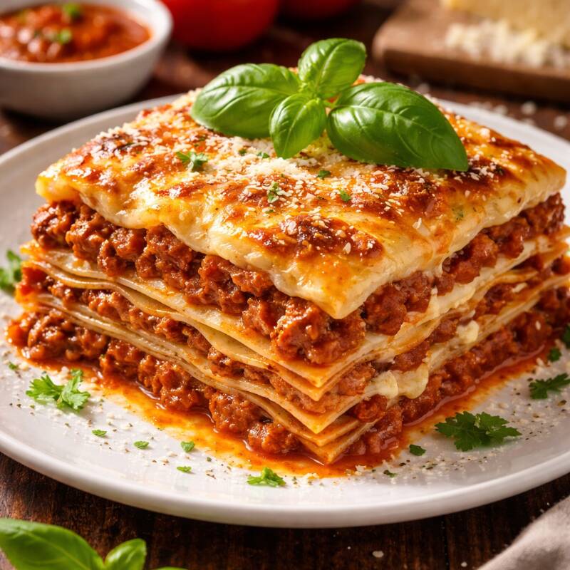 Laminas de pasta Italina, nuestra exquisita salsa boloñesa hecha en coccion lenta para asegurar una sabor exquisito, salsa bechamel y mozzarella gratinada acompañada de tostadas de ajo (Tamaño de 16 Oz peso 450 Gramos)