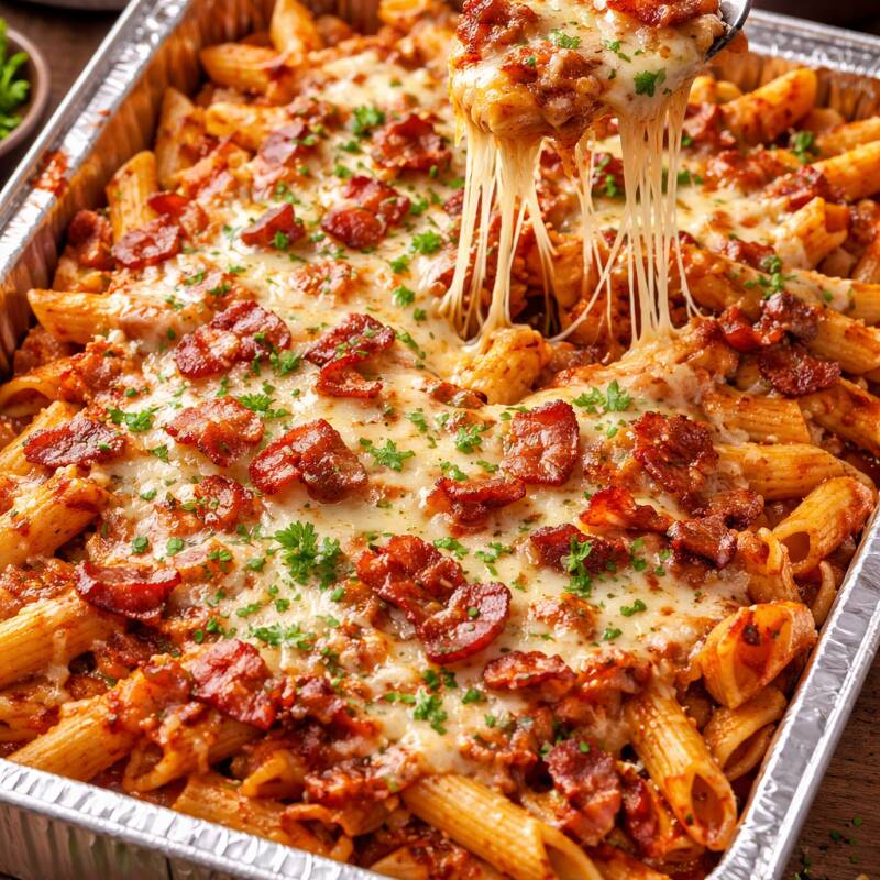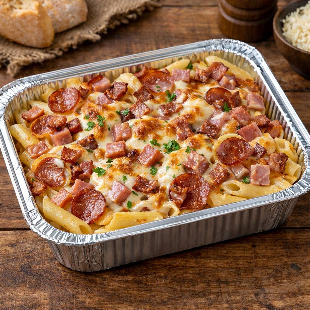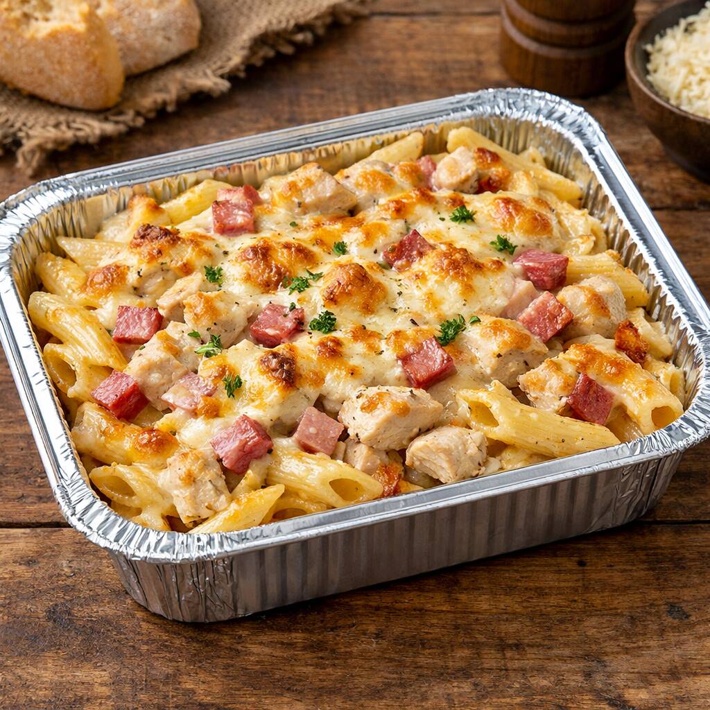 Pasta penne, pollo en tiras, tocineta, pepperoni, jamon, en salsa bechamel, mozzarella gratinada al horno, tostadas de ajo