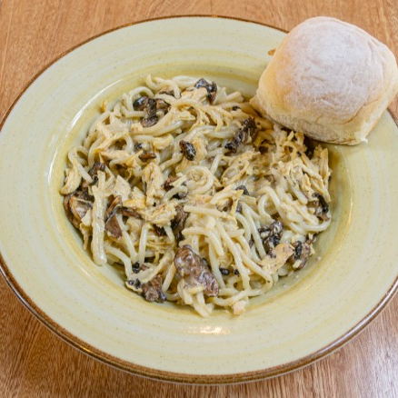 Salsa blanca, pollo y champiñones salteados.