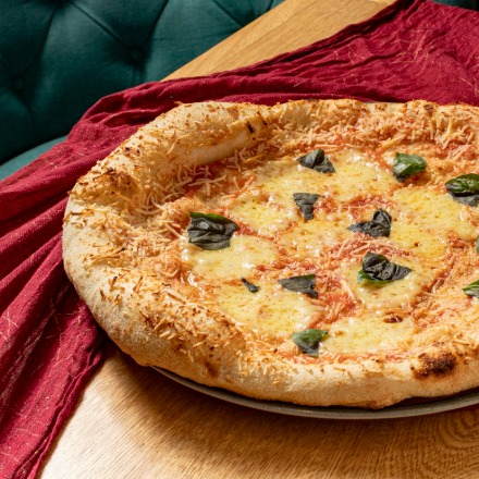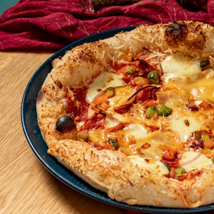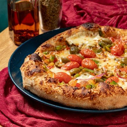 Salsa pomodoro, mozzarella, cebolla, pimentón, tomate cherry y aceitunas.