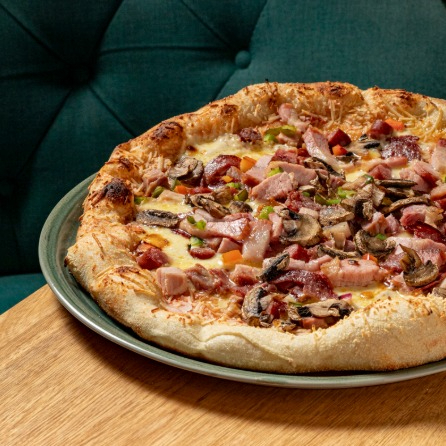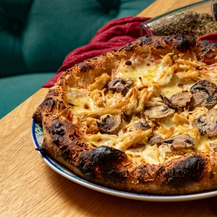 Salsa pomodoro, pollo, champiñones, mozzarella y parmesano.