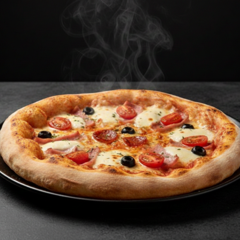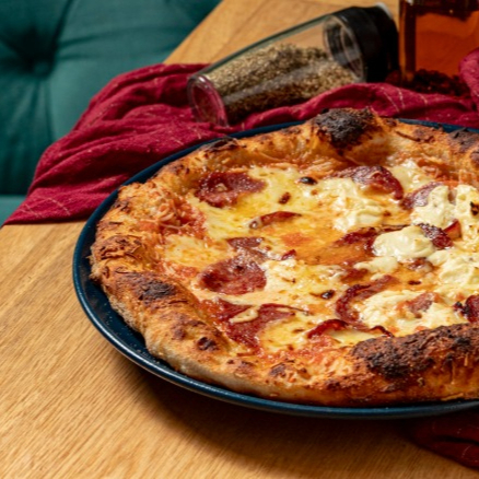 Pomodoro, mozzarella, peperoni picante, salami, tocino, cebolla y pimentón.