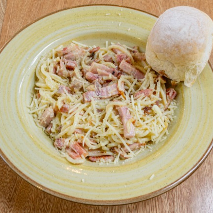 Salsa blanca, tocino y queso parmesano.