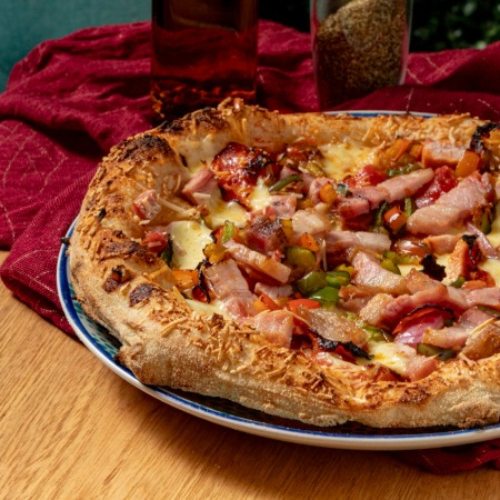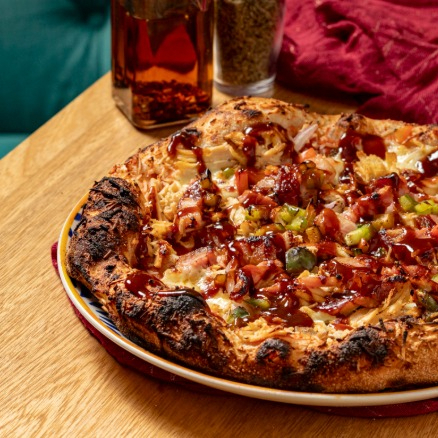 Pomodoro, mozzarella, pollo en salsa BBQ, tocino, cebolla y pimentón.