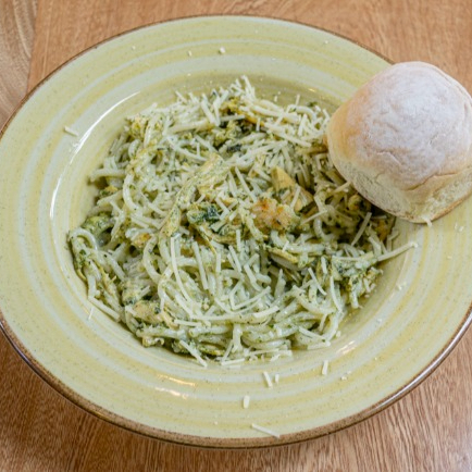 Salsa pesto, pollo y queso parmesano.