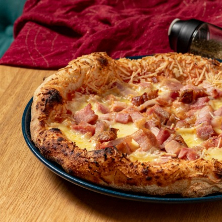Salsa pomodoro, queso mozzarella, jamón y tocino.