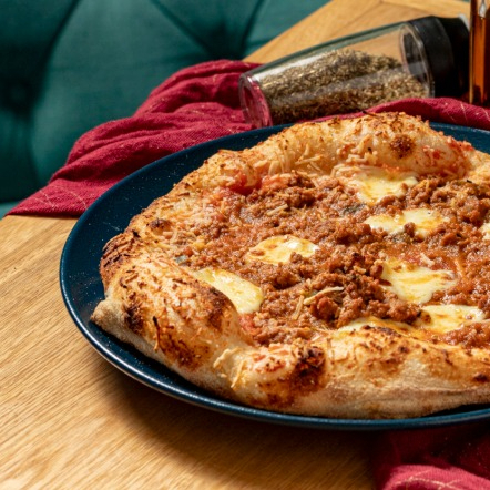 Salsa pomodoro, ragú de carne, mozzarella y parmesano.