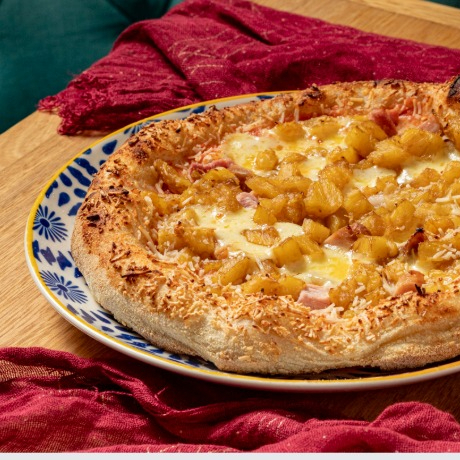 Salsa pomodoro, queso mozzarella, jamón y piña.
