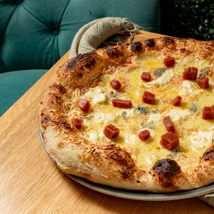 Salsa pomodoro, mozzarella, parmesano, queso crema y queso azul.