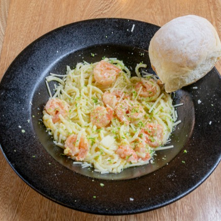 Salsa blanca, camarones frescos y toque de cáscaras de limón.