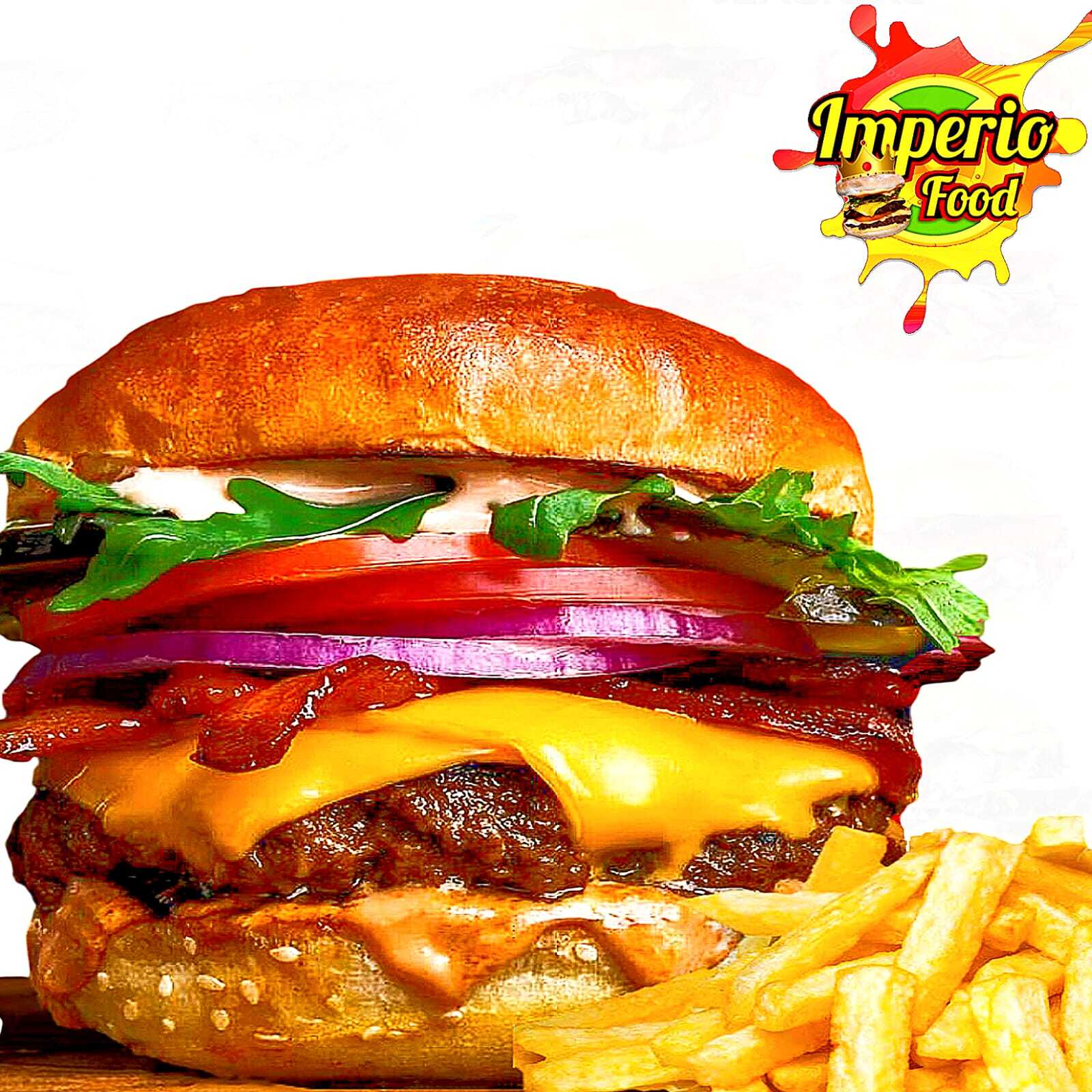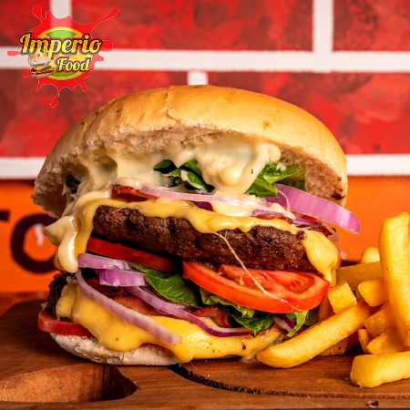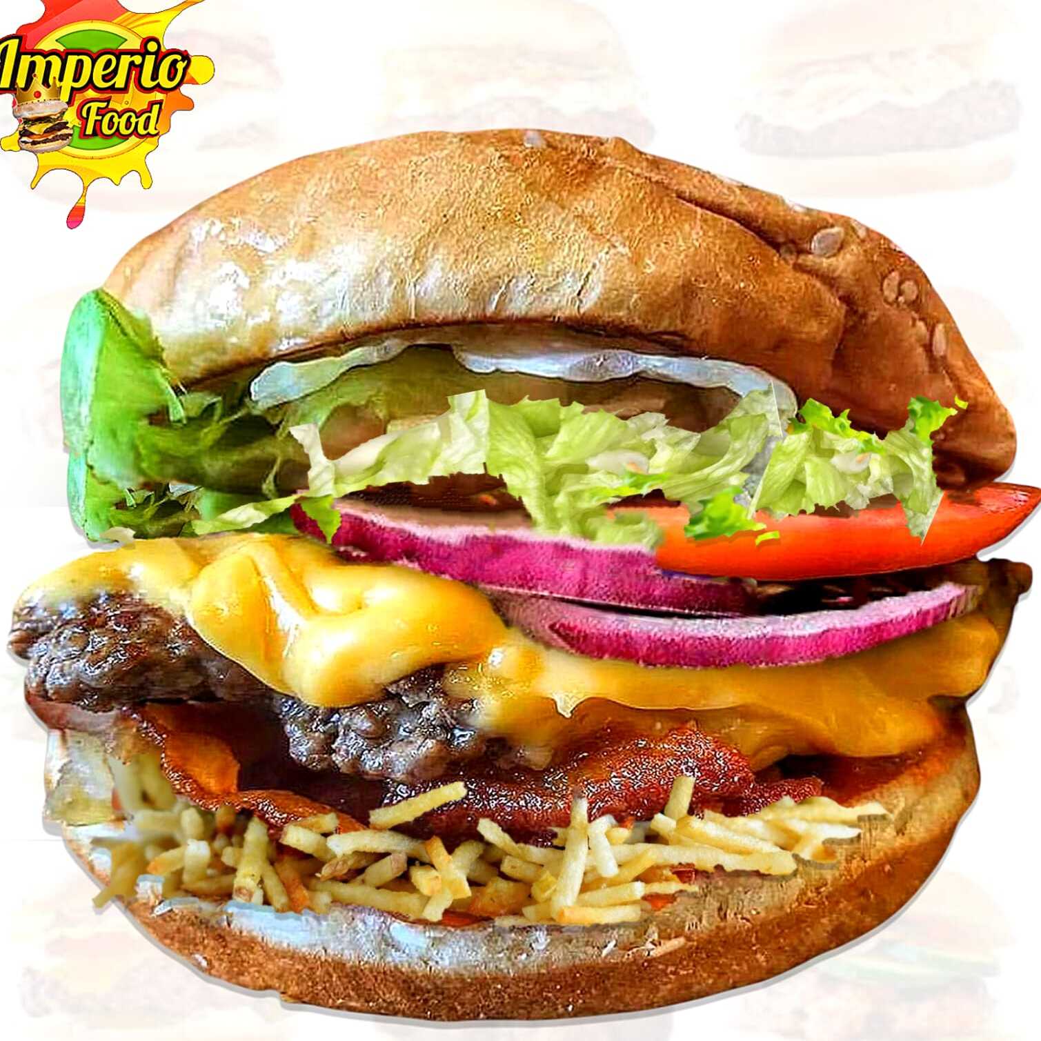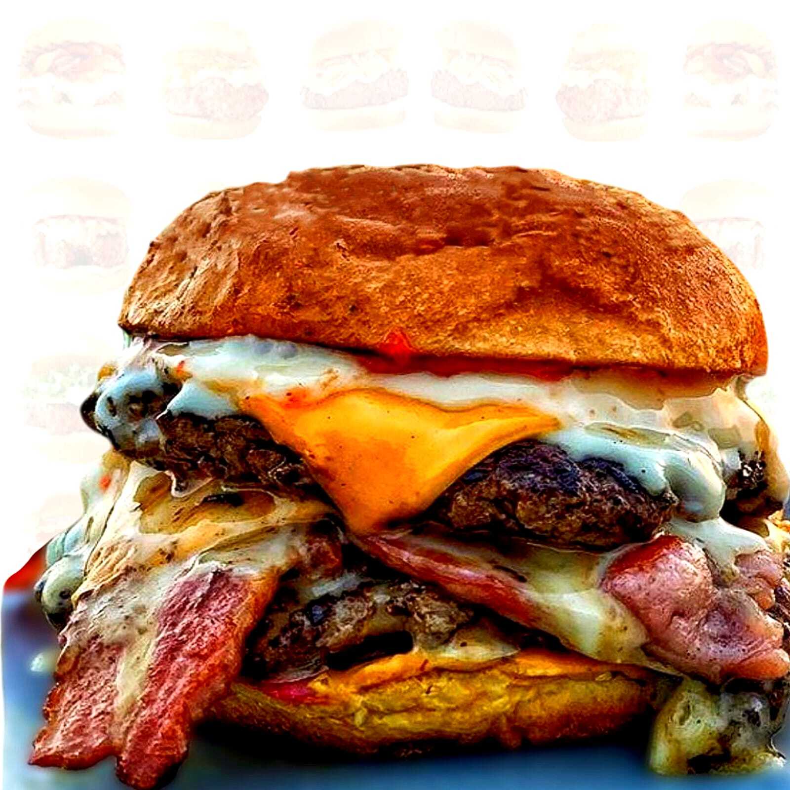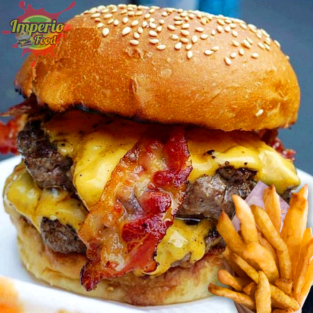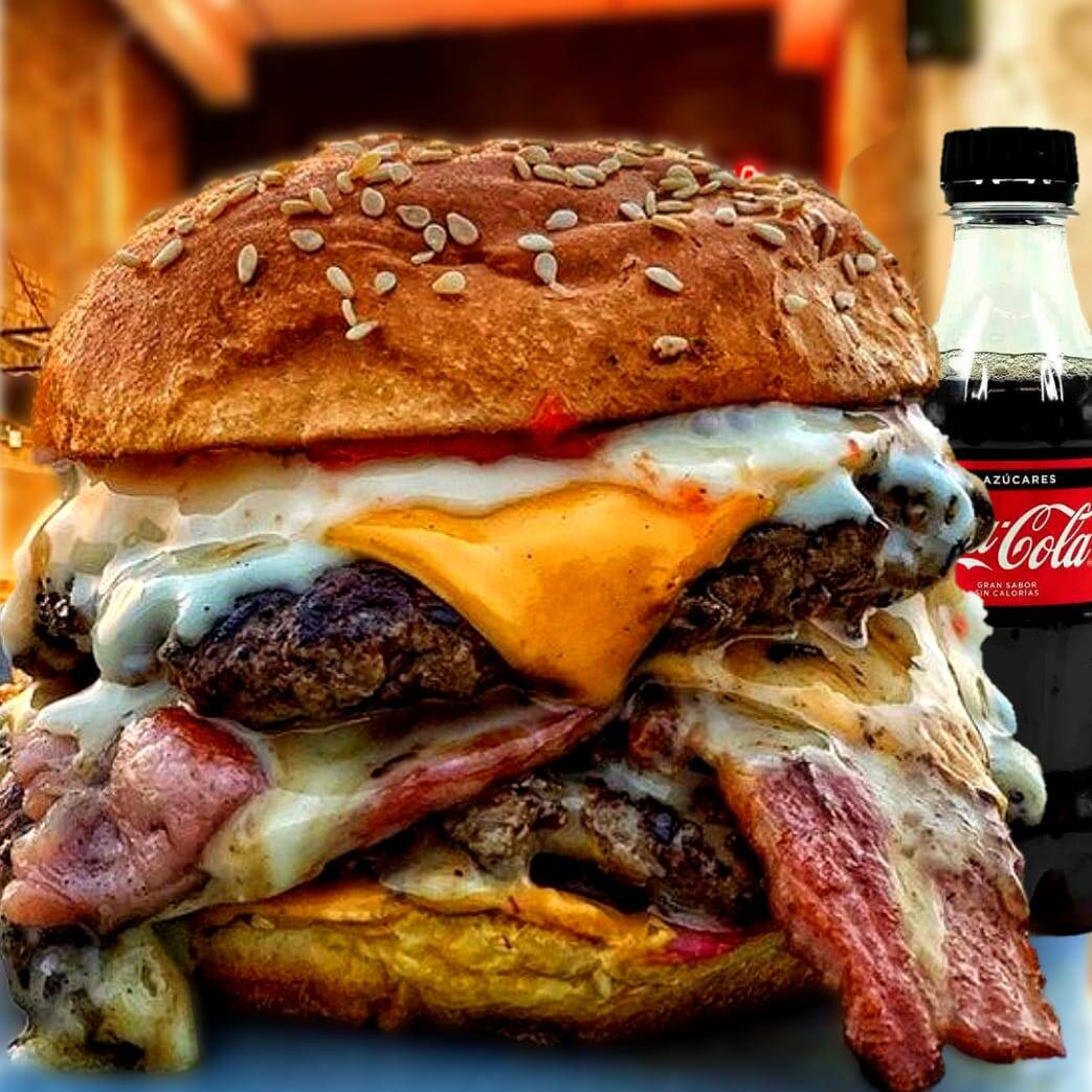 Pan Artesanal, Doble Carne de res, Queso Amarillo Cheddar, Queso Mozzarella, Tocineta, Lechuga Crespa, Tomate, Cebolla Morada, Salsa Chowy, Raosada y BBQ