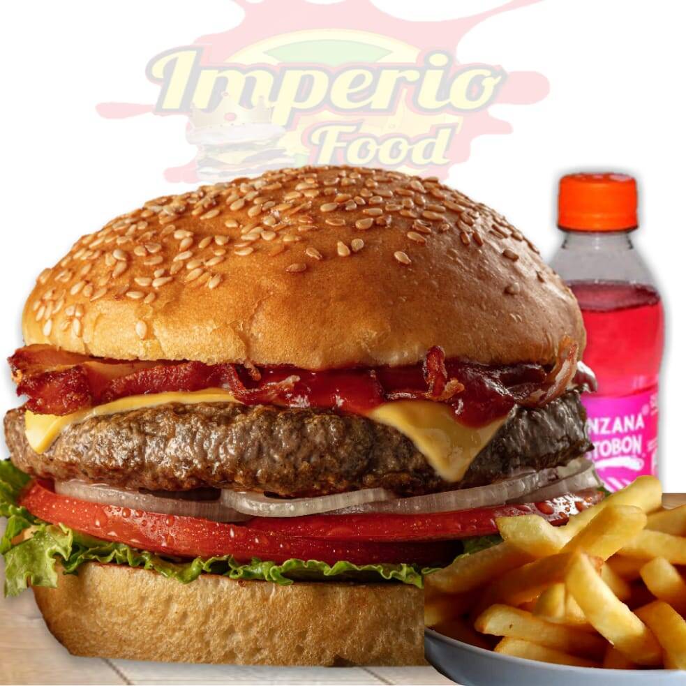 Pan bimbo mamaines, Carne de Res, Queso Mozzarella, Full Tocineta Ahumada, Lechuga Crespa, Tomate, Cebolla morada, Salsa Rosada, BBQ, Mostaza + Papas a la Francesa + Gaseosa 250ml Postobón.