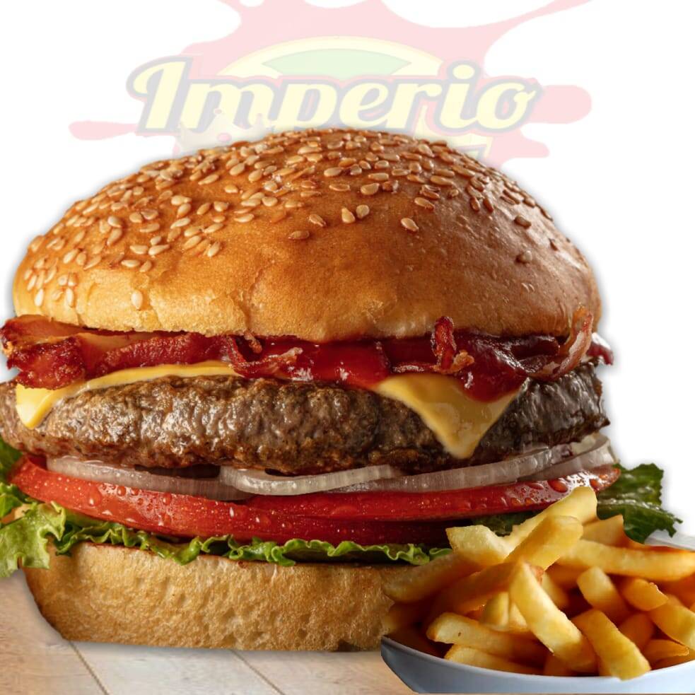 Pan Bimbo mamaines, Carne de Res 80 gr, Queso Mozzarella, Queso Cheddar Original, Tocineta, Lechuga Crespa, Tomate, Cebolla Morada, Salsas BBQ, Rosada, Mostaza + Papas a la francesa