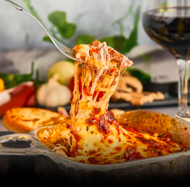 Lasaña con proteína a elegir, queso al gratín y acompañada de pan baguette.