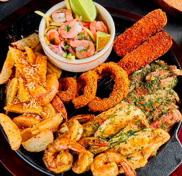 Cóctel de camarón, deditos de trucha apanados, aros de cebolla marinados con nachos, langostinos en salsa pesto, solomo, pollo en julianas y papas a elegir.