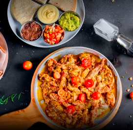 Carne de res, pollo con queso, tomate cherry, chimichurri reducido en vino blanco, tortillas de harina, guacamole, pico de gallo, sour cream y frijol refrito, porción personal.