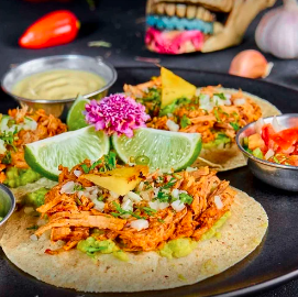 Taco en tortilla de maíz con cerdo adobado en especias, achiote, piña durante 24 horas, acompañado de guacamole, pico de gallo y sour cream.