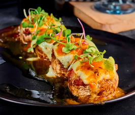 Champiñones rellenos de carne con bechamel y queso gratinado bañado en salsa napolitana de la casa.