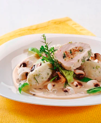 Pechuga de pollo con champiñones en salsa de ajo, tomate, reducción de vino blanco, crema, albahaca, queso, ensalada del día y papas a elegir.