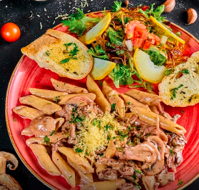 Pasta a elegir con salsa cremosa casera, solomito, champiñones en vino tinto, cebolla, parmesano, lechuga, tomate, vinagre balsámico, puerro caramelizado y pan baguette.
