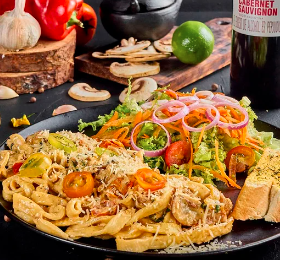 Pasta a elegir cremosa con pollo eb julianas, tocino, champiñones en vino blanco, parmesano, ensalada de lechuga, tomate cherry, vinagre balsámico, puerro caramelizado y baguette.