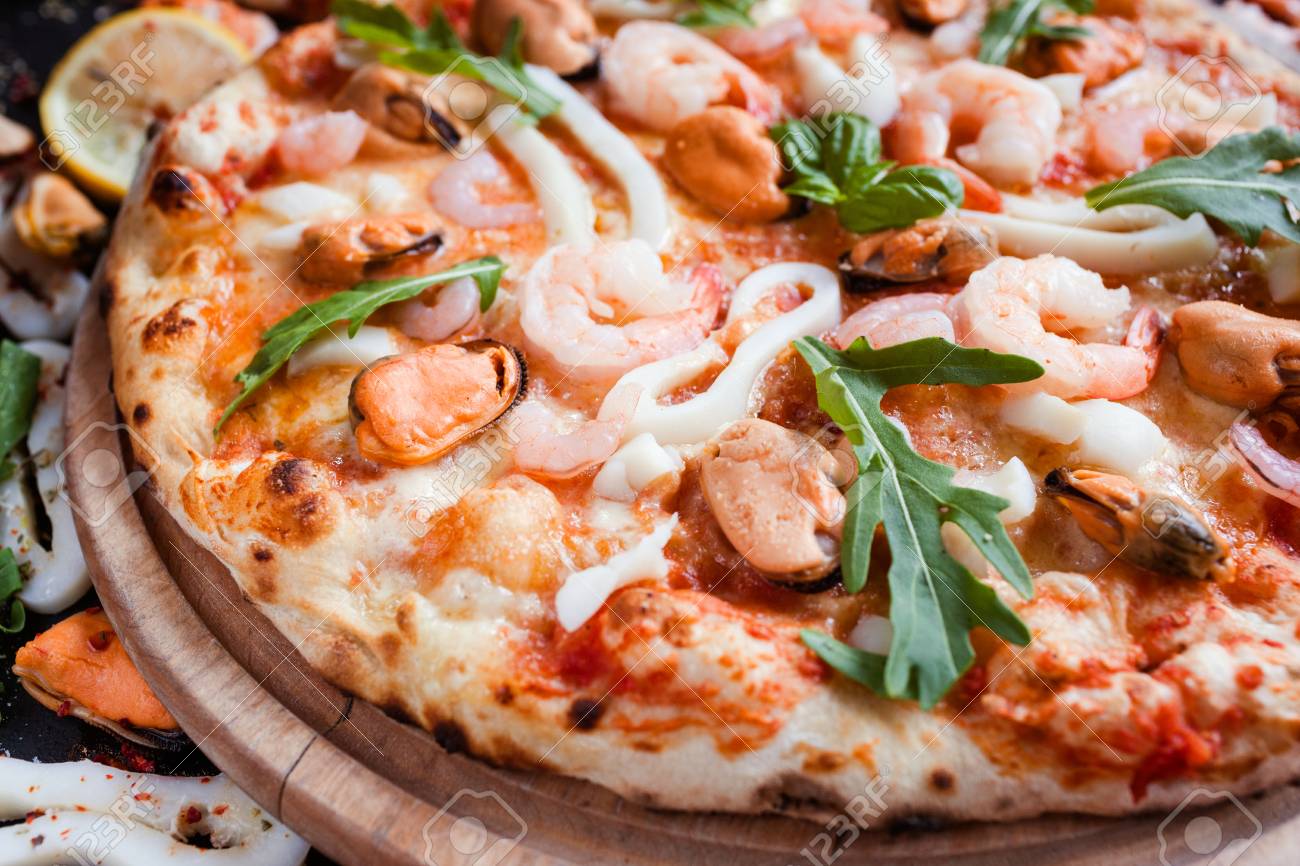 Personal, napolitana, queso mozzarella, camarón, calamar, palito de cangrejo, cebolla, ajo, zuquini amarillo y cilantro.