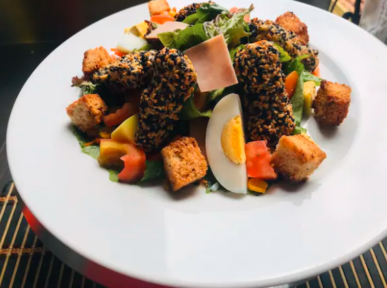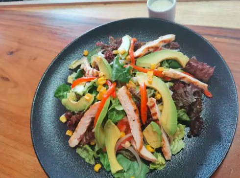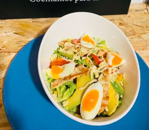 Cama de lechuga, pollo marcado a la parrilla, tocineta, tomate, maíz, pepino, cebolla, aguacate, huevo, queso mozzarella, aderezo de la casa.