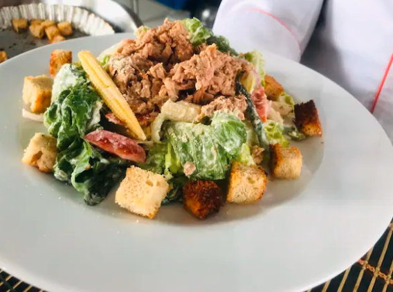 Lechuga verde crespa, pasta, atún, tomate, camarón al ajillo, maicitos, cilantro, cebolla, pimentón, aceituna, salsa de la casa.