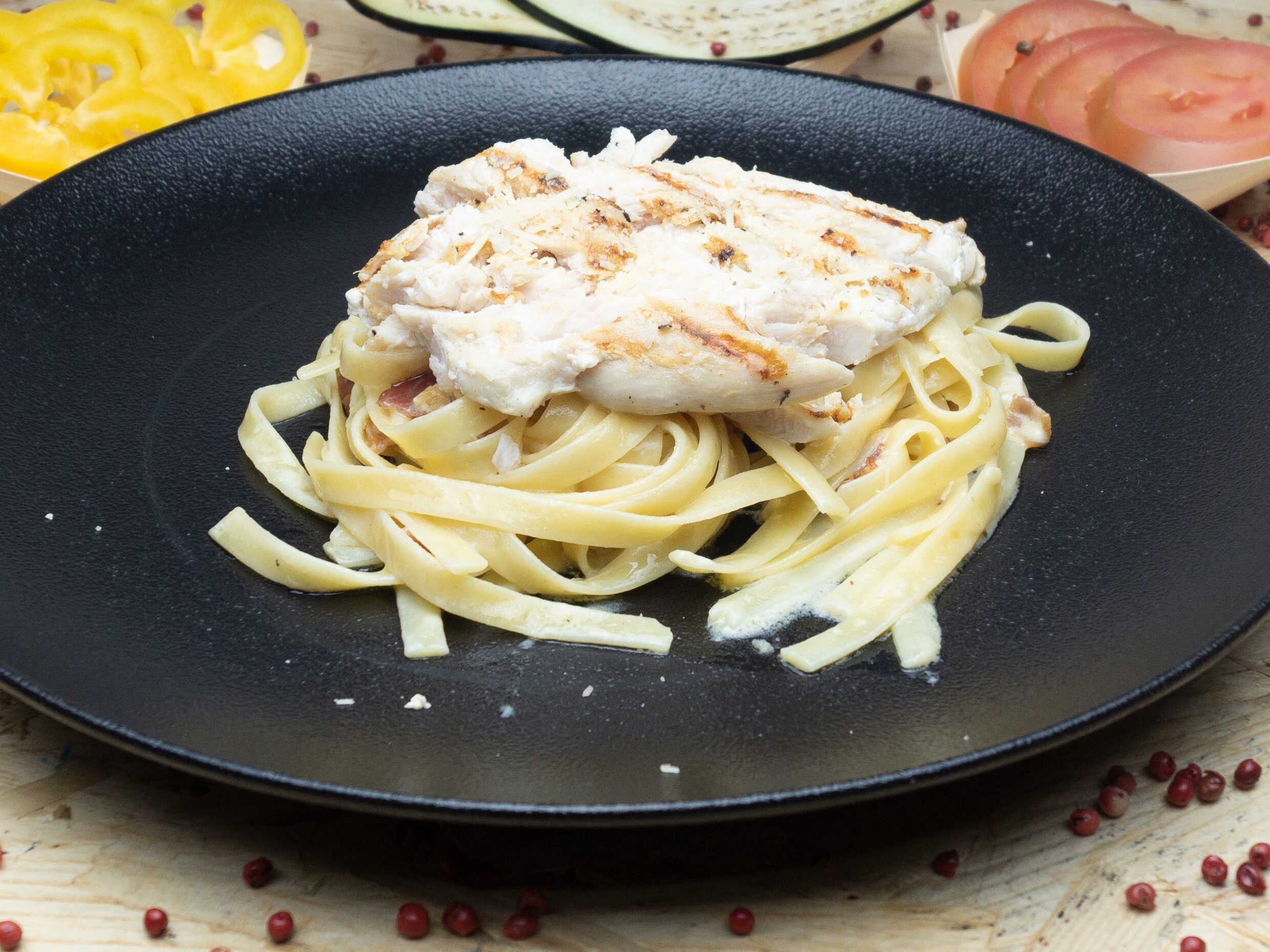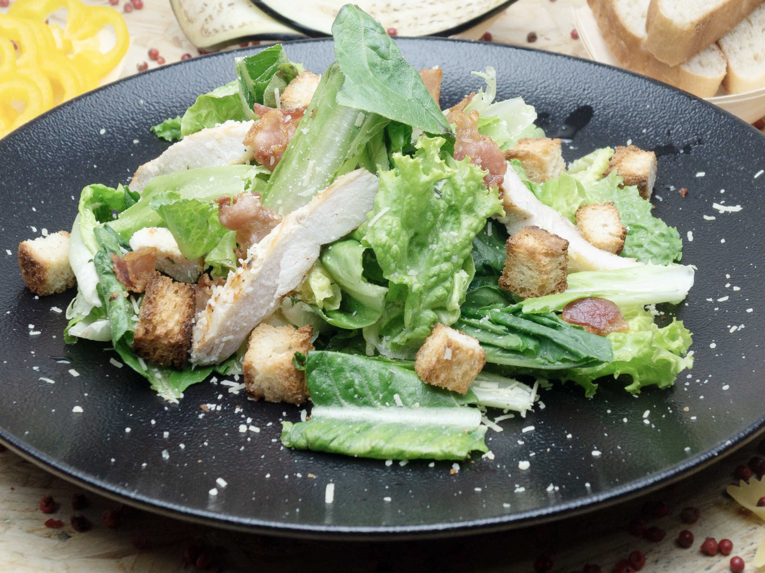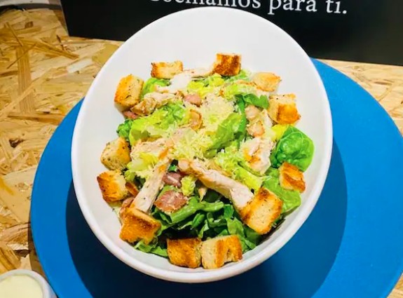Cogollo de romana, lechuga romana, pollo marcado a la parrilla, queso parmesano, tocineta, crotones, salsa cesar.