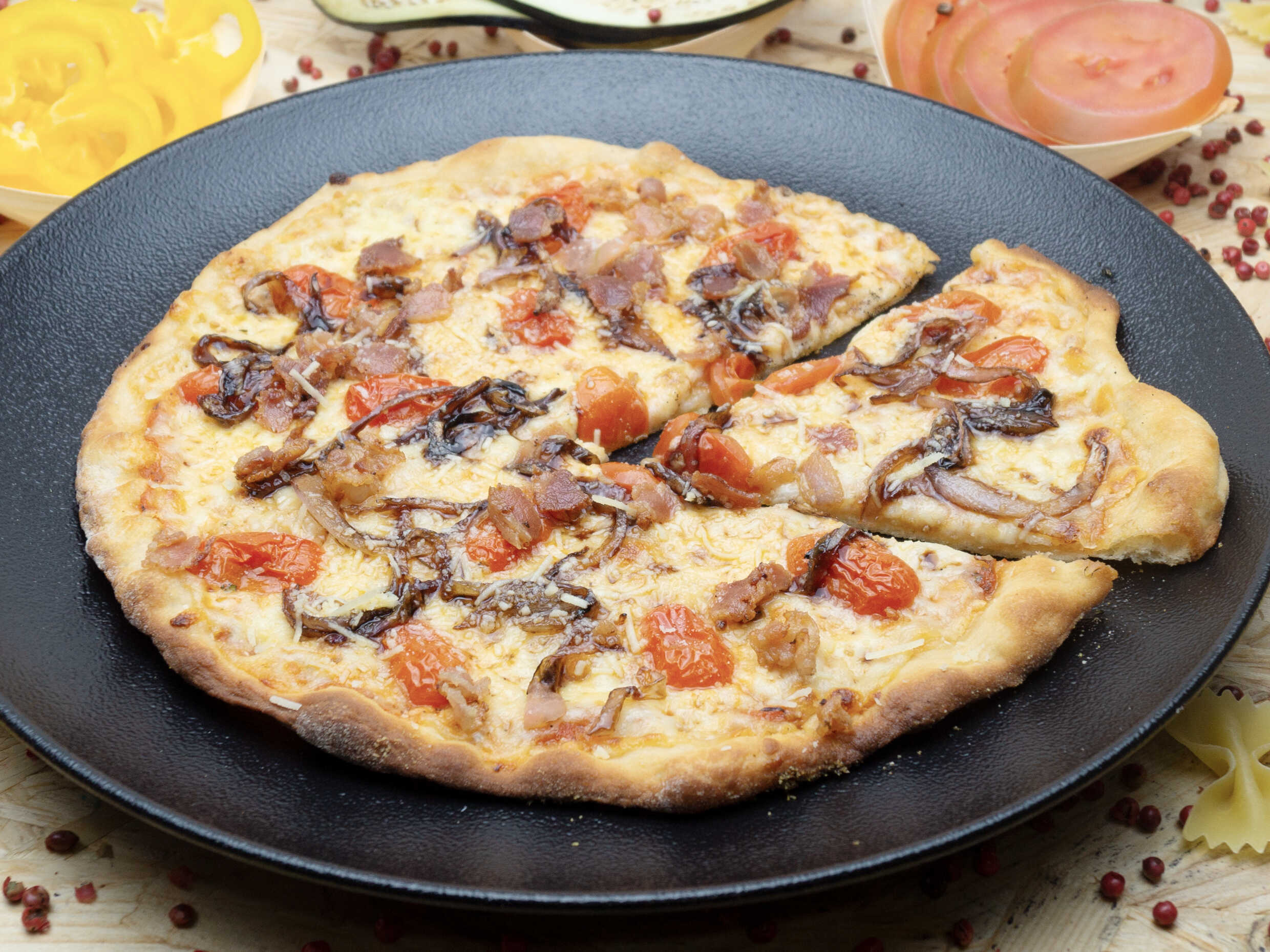 Personal, napolitana, queso mozzarella, parmesano, cebolla caramelizada, tomate cherry, tocineta.