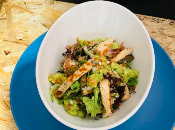 Lechuga verde crespa, lechuga morada crespa, pollo marcado a la parrilla, guacamole, fríjol negro, nopal marcado a la parrilla, pico de gallo, aderezo de la casa.
