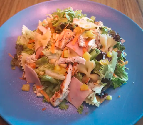 Lechuga verde crespa, lechuga morada crespa, pollo, jamón, piña, zanahoria, pasta, crunch maní, aderezo japonés.