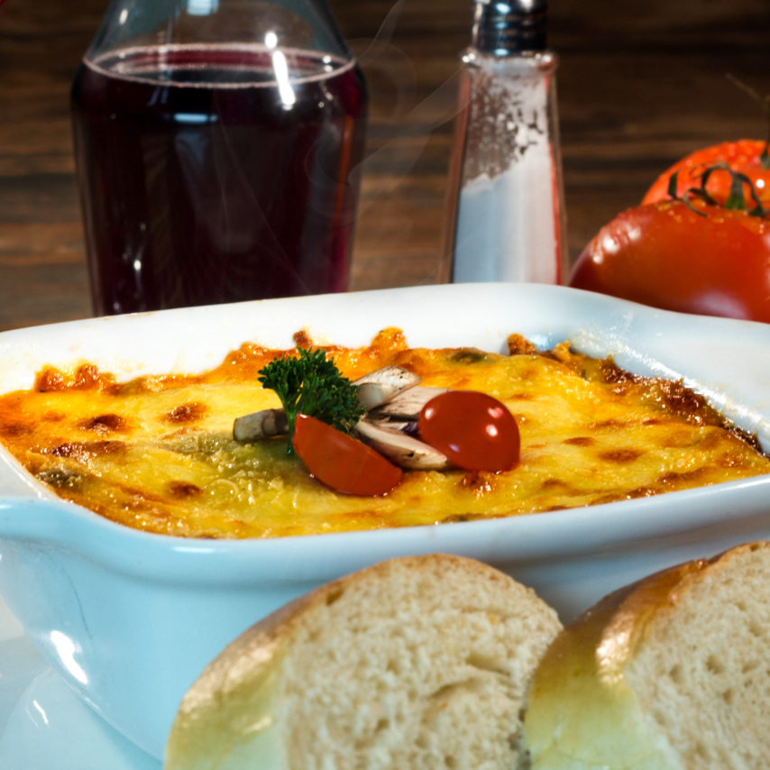 Pollo, champiñón, carne a la boloñesa, acompañado de delicioso pan artesanal.