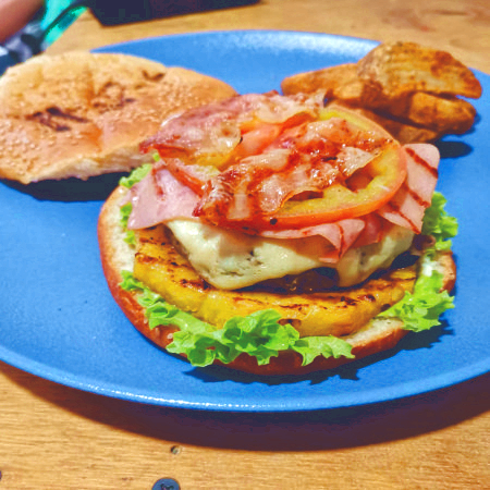 Lechuga, tomate, carne de 120gr, jamón, queso mozzarella, queso cheddar, tocineta, aderezo de la casa, acompañado de papas en casco al horno.