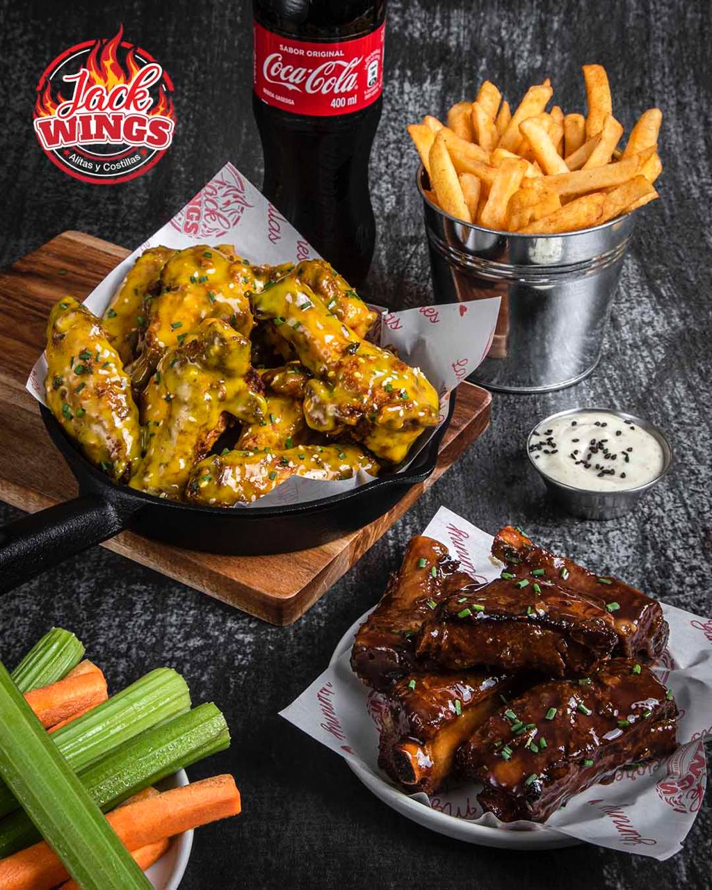 400 gramos de costilla, 12 alitas, porcion de papa, apio, zania, salahorsa ranch, 2 gaseosas 250 ml(dos salsas).