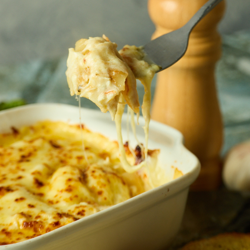 Pastas rellenas de carne ó pollo ó mixtos, bañadas con salsa bechamel, gratinadas con queso mozzarella y parmesano.