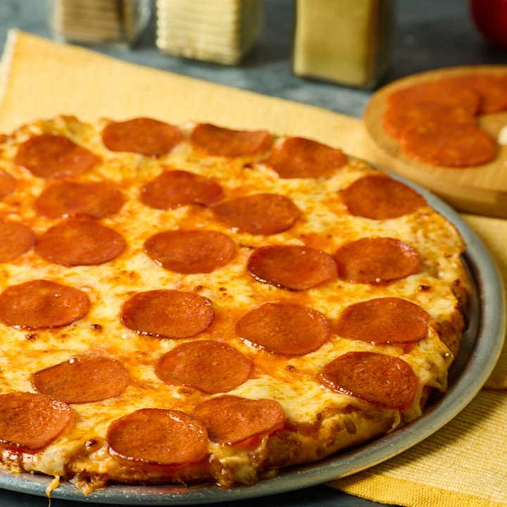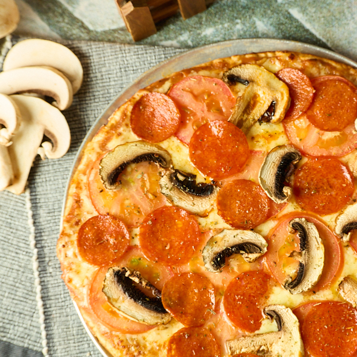 Pepperoni, champiñones y tomate. Base delgada y crocante, salsa y queso.