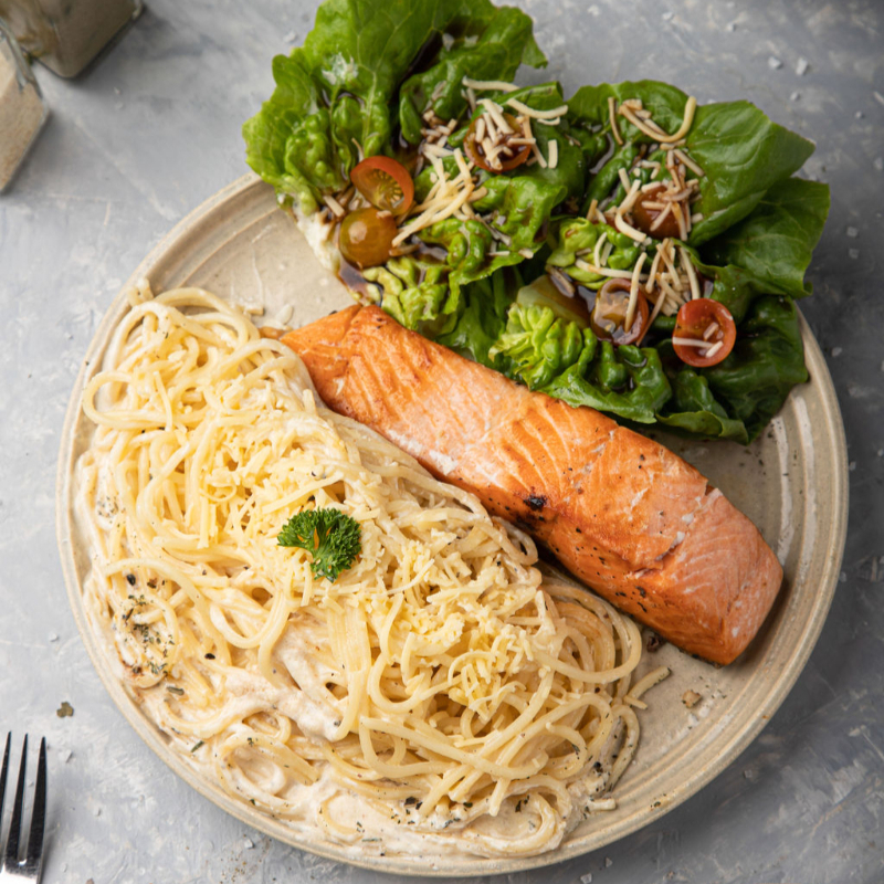 Filete de salmón a la plancha, pasta a elección y ensalada de la casa.