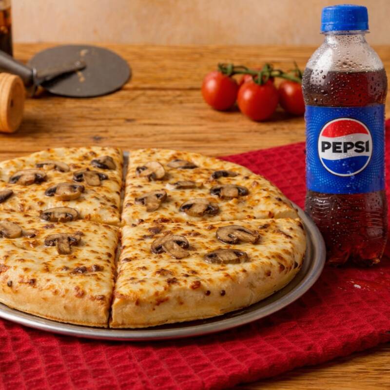 Pizza de pollo y champiñones de 17 cm de diametro (4 porciones pequeñas) rellena de queso crema, cubierta con una delgada capa de masa y triple queso fundido. + gaseosa de 250 ml.