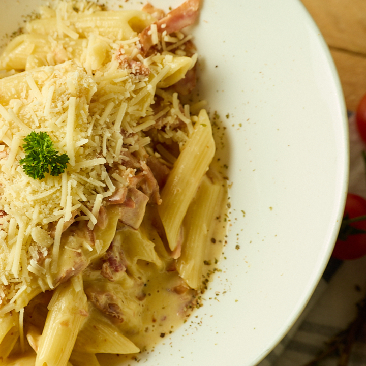 Pasta a elección bañada en salsa carbonara, tocineta y acompañada de pan baguette.