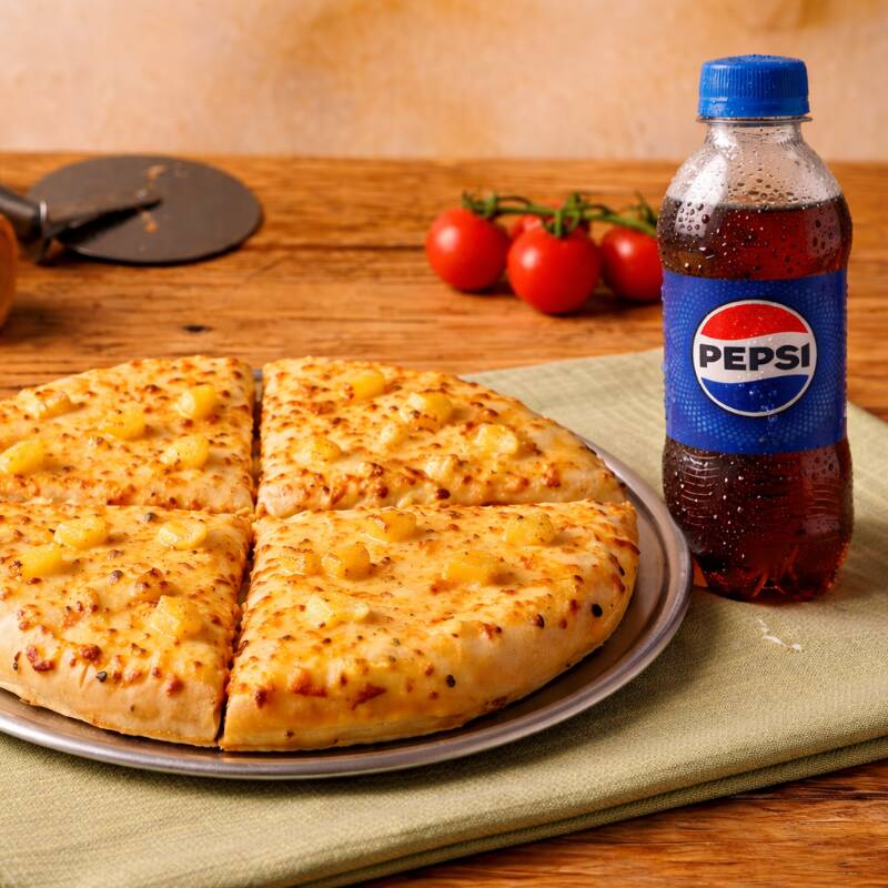 Pizza hawaiana de 17 cm de diametro (4 porciones pequeñas) rellena de queso crema, cubierta con una delgada capa de masa y triple queso fundido. + gaseosa de 250 ml.