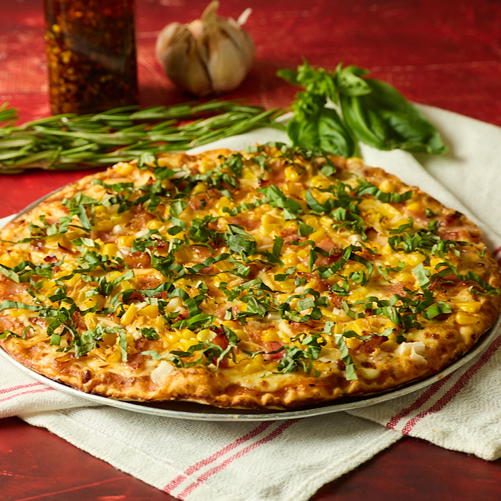 Pollo, tocineta, maíz tierno, cebolla y albahaca fresca. Base delgada y crocante, salsa y queso.